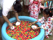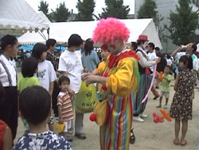 観客もたくさん見に来ている。祭りだ。ゆかたすがたも見えた。ピエロ達が、子供達に風船をサービス。