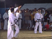 テコンドー、板を足で蹴って割って見せた。