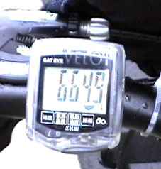 | 私の自転車についてるメータ。今日の走行距離は66.49キロ。 帰り道では雨のためカメラを回すことができずで、撮影写真がありません。雨でも撮れるよう、工夫しなくちゃ。 |
