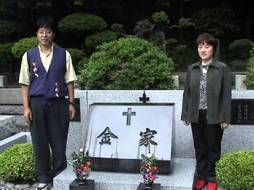 | 花を供えて、水をかける金さん夫妻。 | |||||||||||||