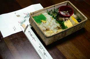 | 12時、弁当の時間だ。これは栗ご飯の弁当。 とてもおいしい。この写真はすこし食べてからのもの。 |