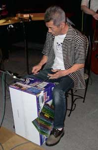 | 上場正俊さんにかかると、 段ボール箱もドラムに早代わり。 |