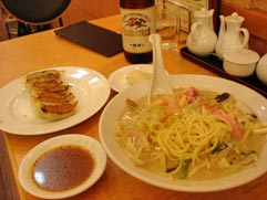 | 昼の時間、長崎チャンポンと餃子1人前、そして中ビン1本飲む。 場所は千日前地下の中央軒。 |