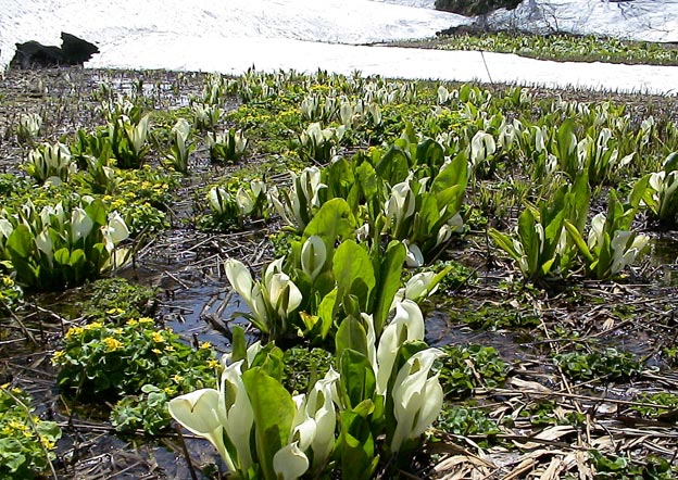 | 沼ノ原湿原(原生花園)いちめんに 水ばしょうが咲いている。まだ満開ではないが・・・。 まだ、雪に覆われているところもある。 |