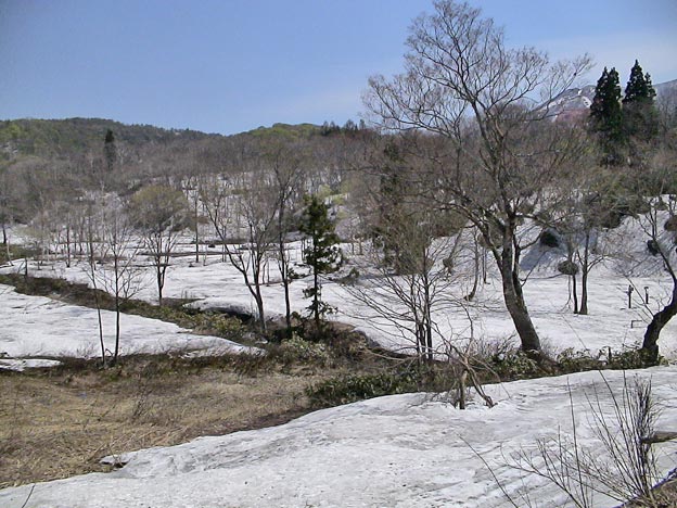 | 斑尾(まだらお)の沼ノ原湿原(原生花園)ではまだ雪が残っている。雪の上を歩くのも気持ちがいい。 | ||||||||||