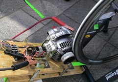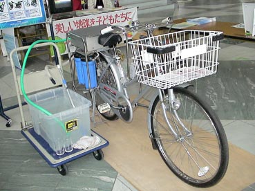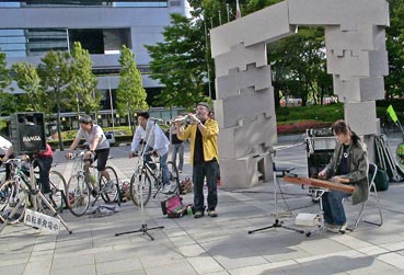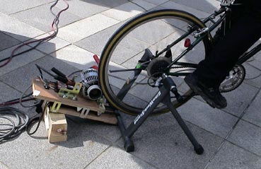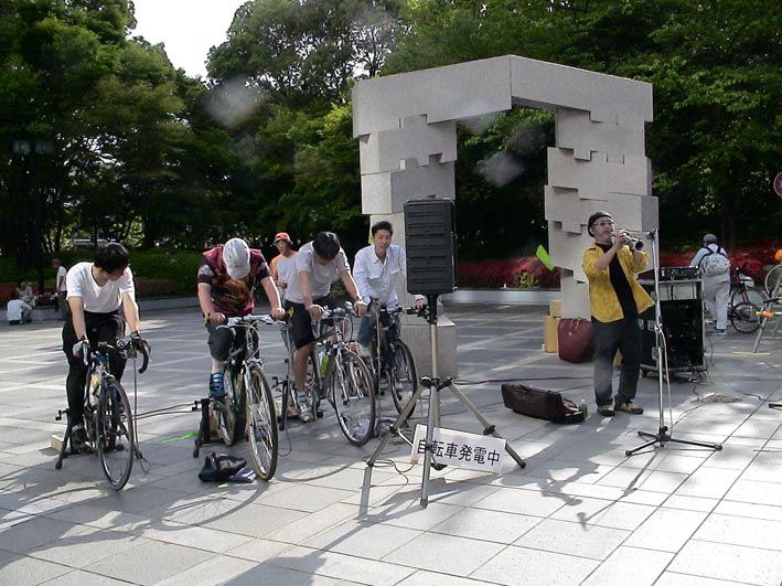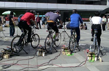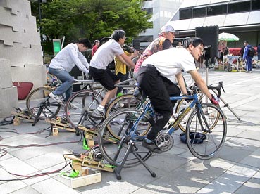 | 参加者が自転車をこいで発電し、その電気を利用してライブステージを実演した。 | |||||||