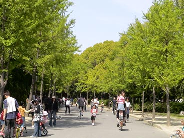 大阪城公園はすっかり青葉が茂り、たくさんの人たちが春を楽しんでいる。