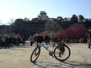 | 梅林からみる、夕日の大阪城。私の自転車も。 | |||||||||||||