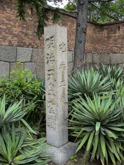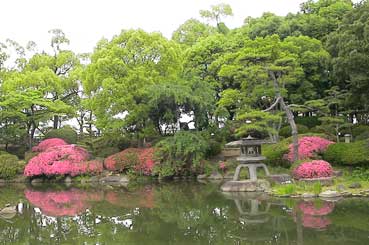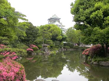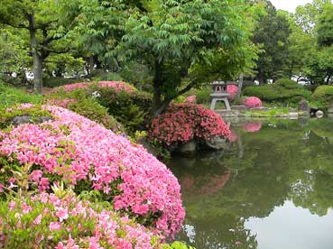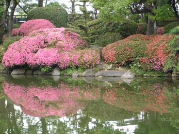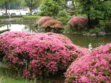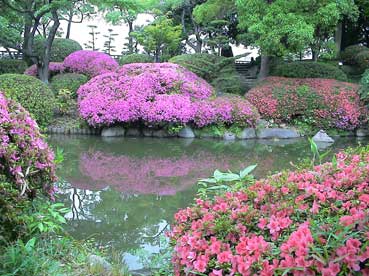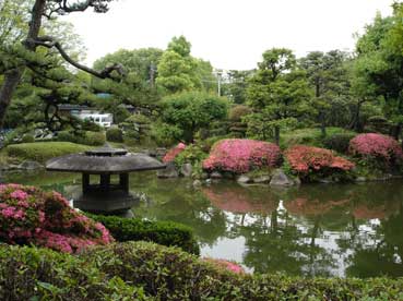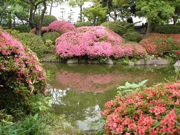 天守閣の広場にある「日本庭園」ツツジの花がきれいだ。 ここには紀州御殿があったそうだ。 昭和の戦争の時は旧軍部がこのあたりを占拠し、一般の人たちは入れなかった。終戦後は米軍が占拠し、火の不始末で火事があり、燃えてしまったという。 |
