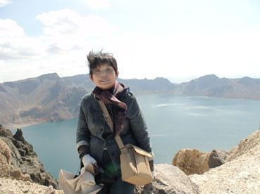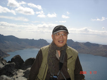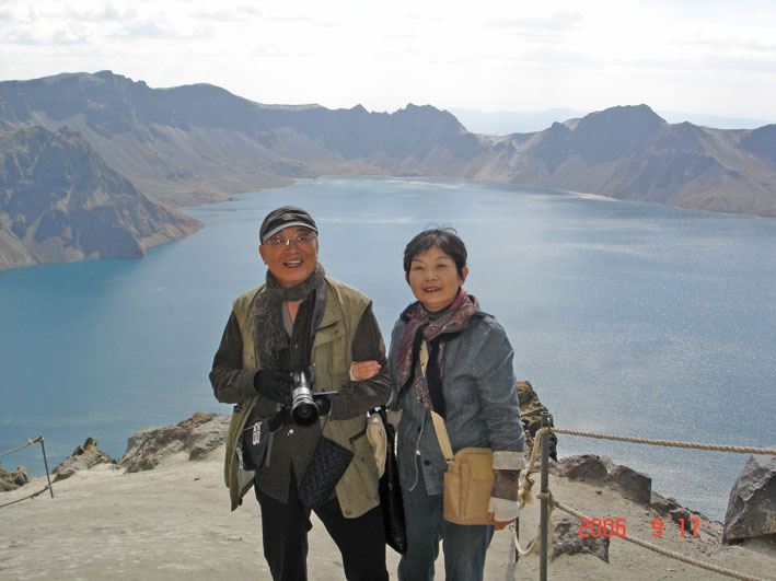 白頭山天池をバックに。