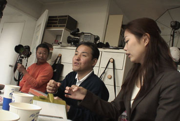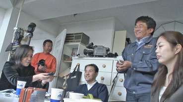 岡田代表や、山崎幹事がインタービューに応じて話をする。 |