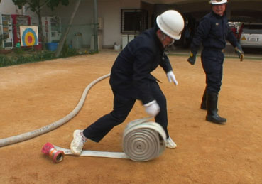 ちょうど、火事が起きたという想定で避難訓練を行っていた。