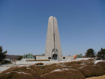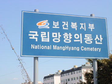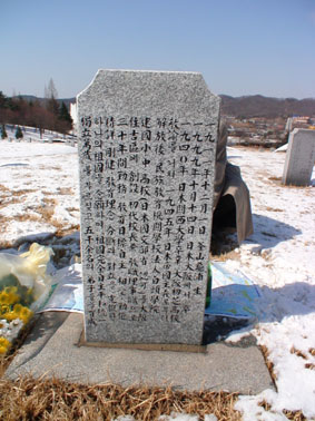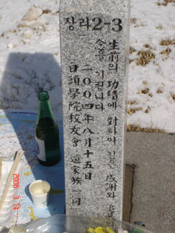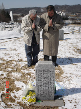 | 金ヒョンテラン校友会会長と二人で、墓前に参りに来たことを報告。 いつまでも建国を見守ってくださることを祈った。 |
