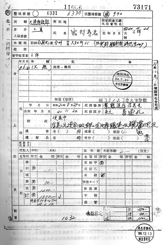 父親が浮島丸で死亡し、靖国神社に合祀したとある。日本名になっていることも注目すべき。