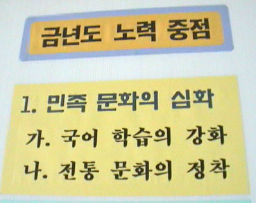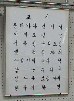 | これは校歌。もちろんハングルだ。「高校野球で甲子園に出れば電光掲示板にハングルの校歌が表示される」と副理事長がいう。 | |||||||||