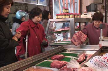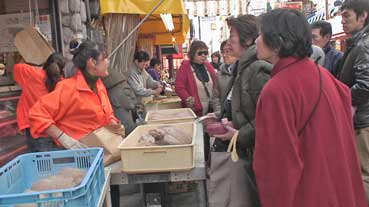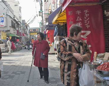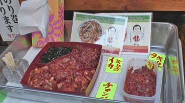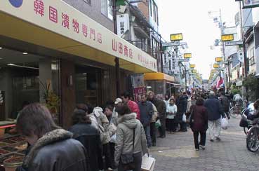 買い物客が多い。あるキムチ屋はずらりと並んでいた。