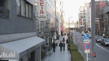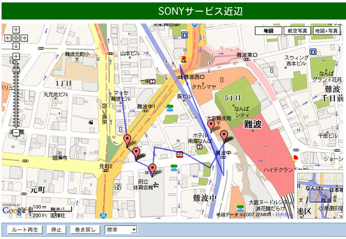 | ソニーサービス前ではビルの陰になるのかGPSに電波が届かない。それで近くの陸橋にあがると、GPSは反応した。 | 陸橋の上から見た府立体育館。ソニーサービスの前にある。 | |||||||