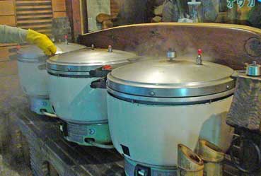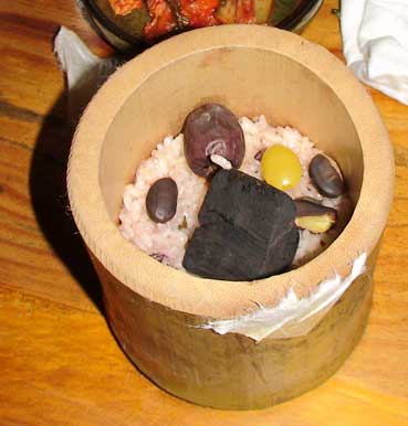 | ご飯は竹の器に米やナツメ、豆、銀杏などを入れ、それに炭も入れて、この釜で蒸したご飯だ。おいしい。 | |||||