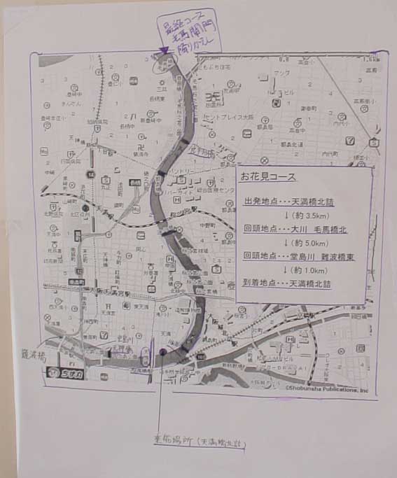 2007年4月15日、粋な大阪をつくる会が、矢形船を乗っての花見会を行った。GPSを持っているので、地図を作成しようとしたが、残念ながら記録したGPSを川に落としてしまった。