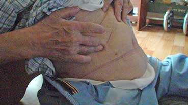 | おじさんの手術傷を見せてもらった。胆のうに石が溜まっていた。胆のうを取りだしたという。 | |||||||
