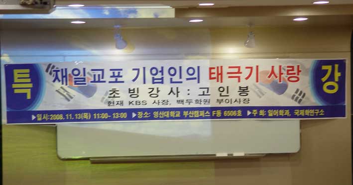 ヨンサン大学の講義室には大きな垂れ幕がかかっていた。間違いもあるが。