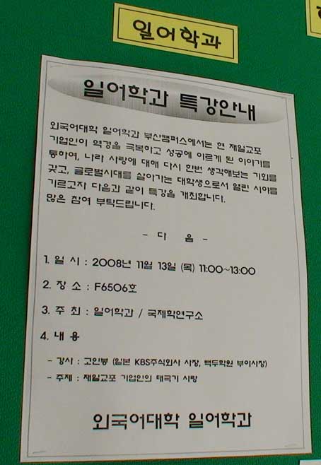 | 掲示の内容は日時、場所、主催は日本語学科/国際研究所となっている。私の紹介は少し間違いがある。 | ||||||