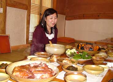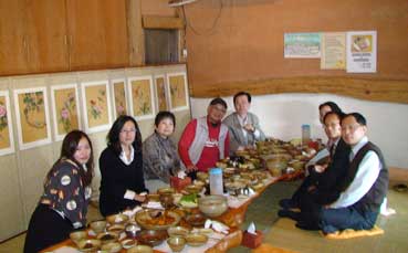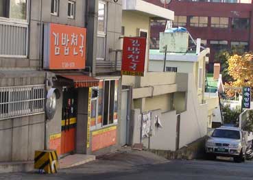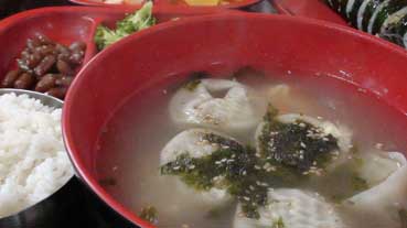 | 宿の近くの食堂「キンパブ天国」で、饅頭汁を朝食に | |||||||