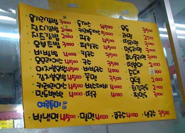 | 値段表を見ると安い!カルグッスは4千ウオンだ。 | |||||||