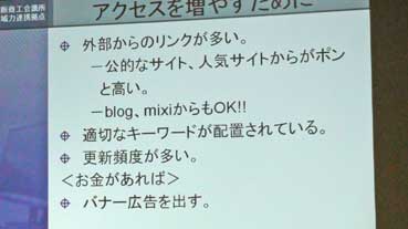 | アクセスを増やすには、せめて月1回は更新するのが望ましい。フォーラム・アイのページは更新がされていない。いい情報がありながら、発信できてないのは、もったいない。 また商工会議所会員だから、ザ・ビジネスモールも大いに利用すべきだ。せっかくだから、ここに、営業品目を入れるべきだ。 |
