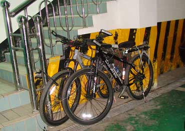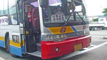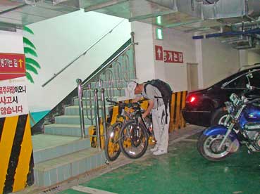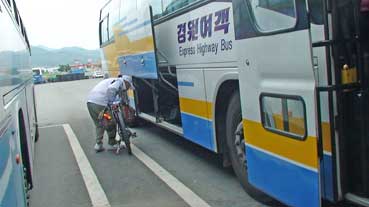 | 前輪だけ外して、ハンドルを横にし、くくる方がいいようだ。別に輪行袋に入れなくとも、バスの荷物入れの場所が空いていれば、いい。要するに自転車が入る場所さえあればいいのだ。 これで、韓国の市外バスに自転車を乗せるのは問題ないことが分かった。 |