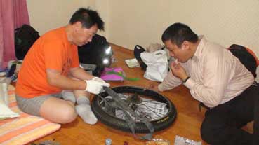 | 朴正泰さんのタイヤがパンクした。宿泊する部屋で修理をした。 | ||||||