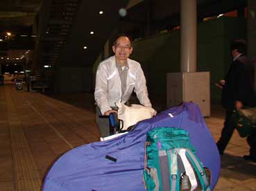 | 許さんの車で、自転車がある宿へ戻った。 自転車屋に電話をして、自転車を運んでもらうことにした。自転車屋で車輪を返し、輪行袋に自転車を入れ、空港へ自転車屋の車で運んでもらった。 |
