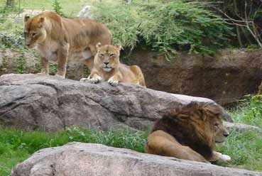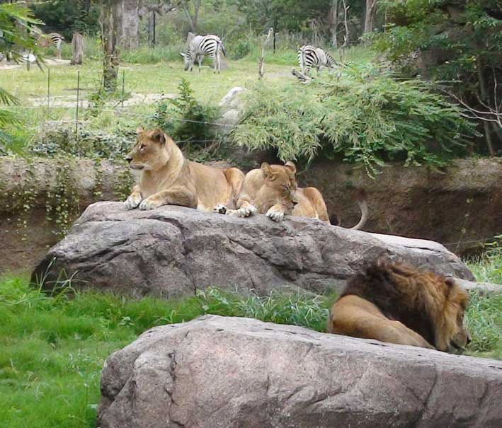 ライオン、後ろに見えるのはシマウマ