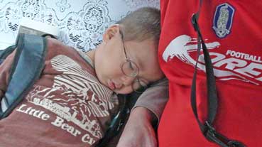 | あそび疲れてか眠ってしまった。 通天閣に登る事や、新世界で串カツを食べるのもお預けになった。 |