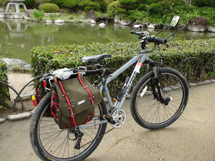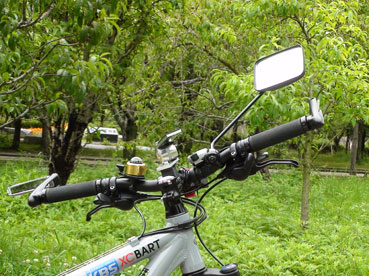 私の自転車MTB。右のバックミラーが壊れたので、前のミラーを付けた。
