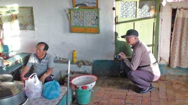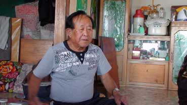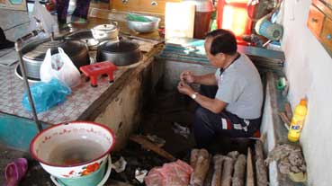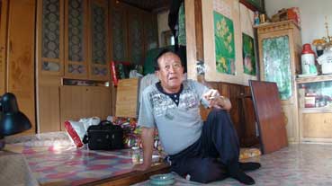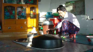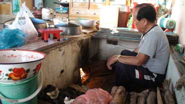 田舎の家、ホチョルさんの父かまどの火をおこす。