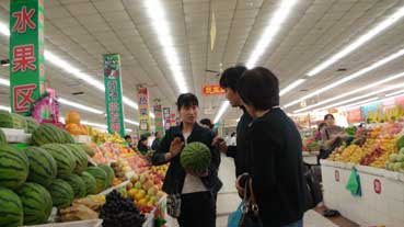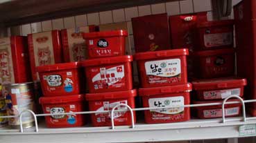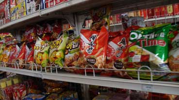 | スーパーには韓国産のみそなどの食材がたくさん売られている。 | 韓国のお菓子類も多い。 | ||||