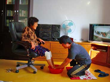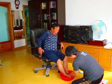 | <このコーナーは番外版> 10月9日は、ホチョルさんの父の誕生日です。父と母の苦労を感謝して、8日に足を洗ってあげました。 |
