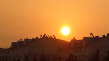 | あさ、宿の窓から太陽が昇る景色がまぶしい。 | |||||||||