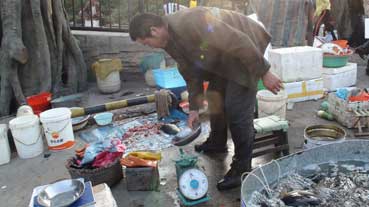 | 朝市だが、6時から9時頃まで行われるという。 にぎやかだ。いろんなモノを売っていた。食品が多い。朝食をする人も多かった。 |