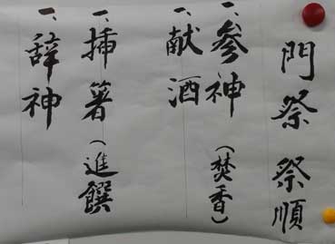| 祭主(右端)がお供え膳を不備はないか、点検する。 | 紙榜(チバン)という紙で作った神位。 | |||||||