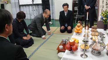 | 終わって、お膳は奥さんが片付け、台所へ持って行き、お供え物を少しずつ入れた酒杯は植木の根元に注ぐ。 | |||||||