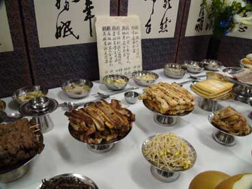 左に小さなお供え膳は家の神にするもの、「門祭床」(ムンジェサン)という。