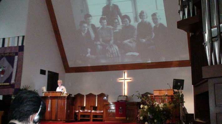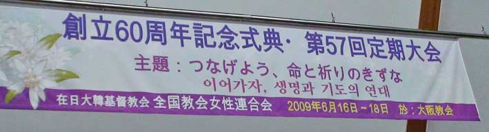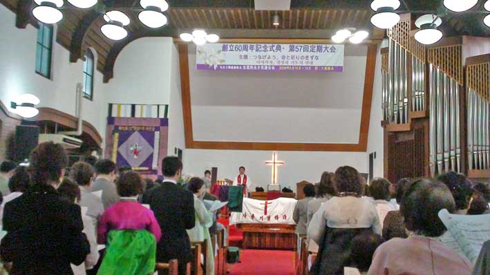大阪教会で午後1時から受付が始まり、60周年記念礼拝で鄭然元牧師の説教があり、記念講演に、