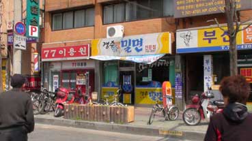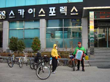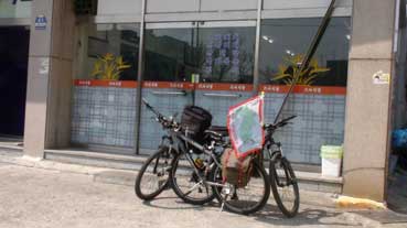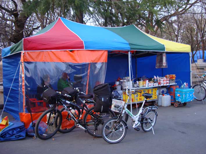 | 朴正泰さんの自転車がパンクした。親切な人がいて、自転車屋を教えてくれて、すぐ修理ができた。 | 昼食にカルグッス(うどん)を食べる。 | ||||