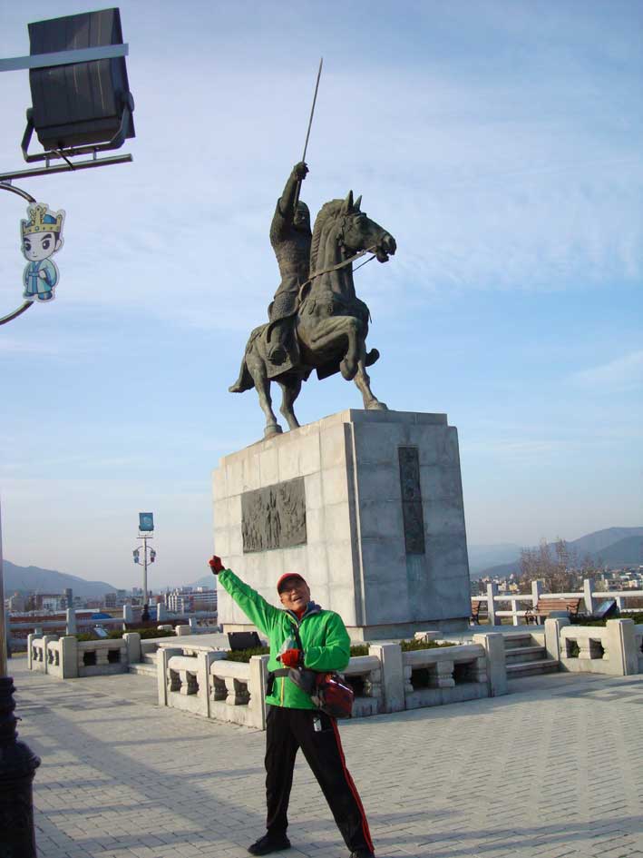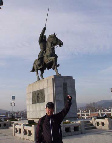 金ユシン将軍の銅像をバックに