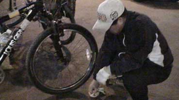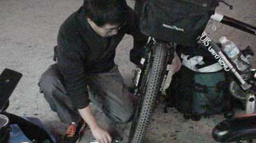 朴正泰さんの自転車前輪の心棒のナットが無くなっていた。これは、困った。