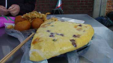 屋台があり、そこでイカの天ぷらやパンなどを食べて、朝食とした。