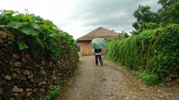 傘を借りて、歩いて村の中を見学することにした。とりあえず、城壁の上を歩くことにした。