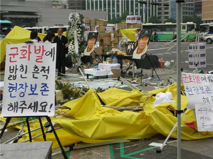 市民が作った焼香台やテントを警察は取り壊した。